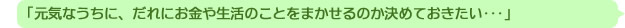 今はしっかりしているけど、将来、判断能力が不十分な状態になった場合に備えて、代理人(任意後見人)を選んでおく制度です。